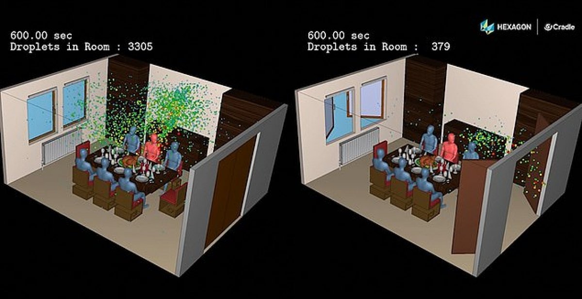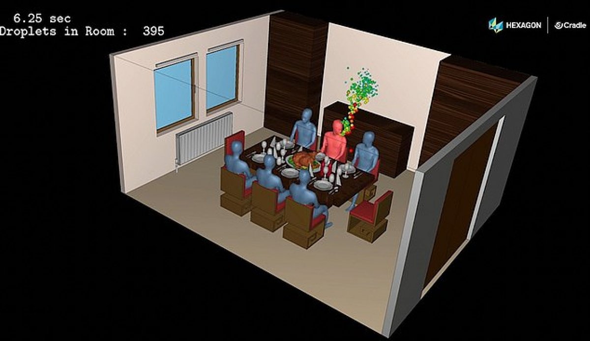 Bir odada yemek için toplanan kalabalıkta birinden yayılan koronavirüs parçacıklarının nasıl deverana girdiği ve öteki insanlara nasıl bulaştığı görüldü.